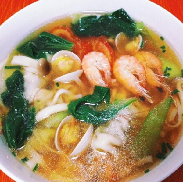 待水餃和面條差不多快熟的時(shí)候,放入菜葉,焯過(guò)的蝦、蛤蜊和番茄。記住菜葉要整片的,不然一燙就沒(méi)了。等待一分鐘拿來(lái)大面碗起鍋吧。怎么樣,色香味俱全誘人吧,趕緊行動(dòng)吧。